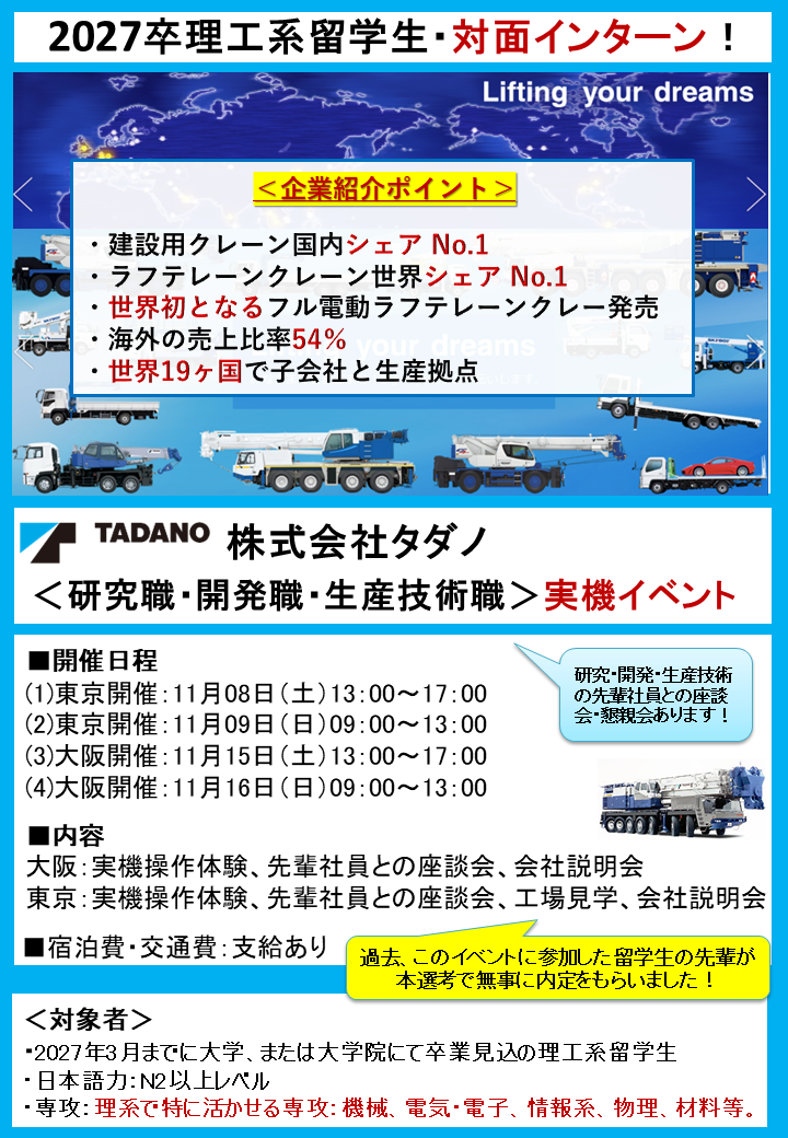 <注意点>留学生のための説明会です。株式会社タダノの夏インターンシップに興味がある方、今回の説明会にぜひご参加ください!!