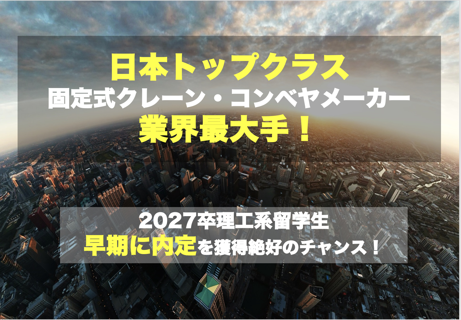 ・クレーン、コンベヤの次世代技術の開発職(機械系、制御系、電気電子系、情報系) (※デジタルトランスフォーメーションや自動化・無人化系の開発業務) ・クレーン、コンベヤの設計職(機械系、制御系) ・クレーン、コンベヤの施工管理職(機械系、電気系) ・クレーンメンテナンスの設計職(機械系、制御系) ・クレーンメンテナンスのサービスエンジニア(機械系、電気系) 【応募条件】 1、卒業年度:2027年4月〜2028年3月まで4年制大学、大学院卒業(見込み)の方 2、専 攻:機械・電気電子・情報・制御・メカトロニクス 3、日本語能力:日本語能力試験N2レベル以上 【基本給】(2027卒) ・大学院:28,9700円/月 ・大 卒:26,2500円/月 【勤務地】東京本社(独身寮、借上社宅制度あり)
