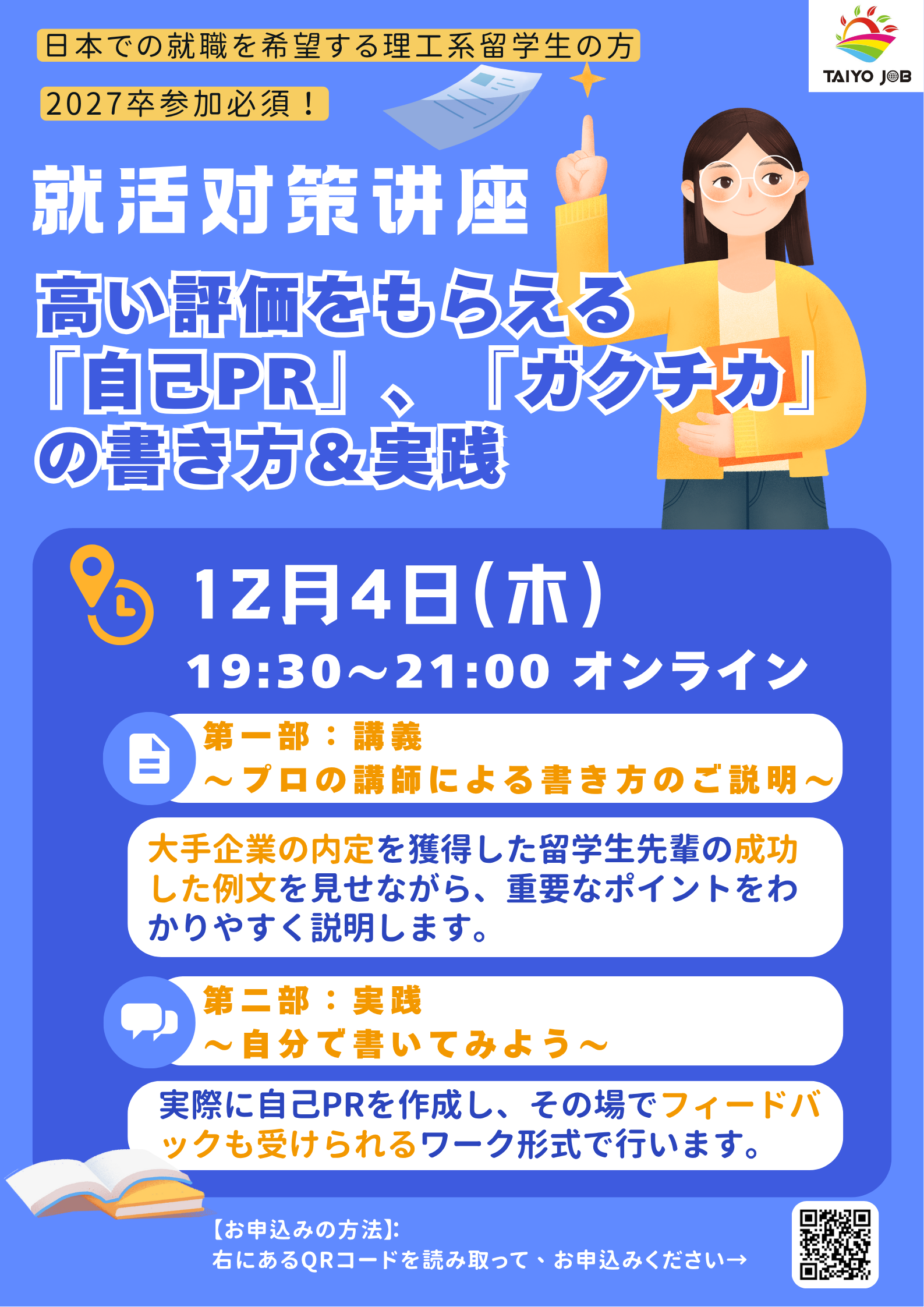 【就活対策講座】 テーマ:『高い評価をもらえる「自己PR」「ガクチカ」の書き方&実践』 ▼このような方に特におすすめの講座:これから就職活動を始める理工系留学生の方 ・自己PRやガクチカの質を高めたい方 ・大手企業から高い評価を得たい就活生 ・何を書けばよいのか、どのように書けばよいのか分からない方 本講座は、理工系の専攻分野を問わず、どなたでもご参加いただけます。