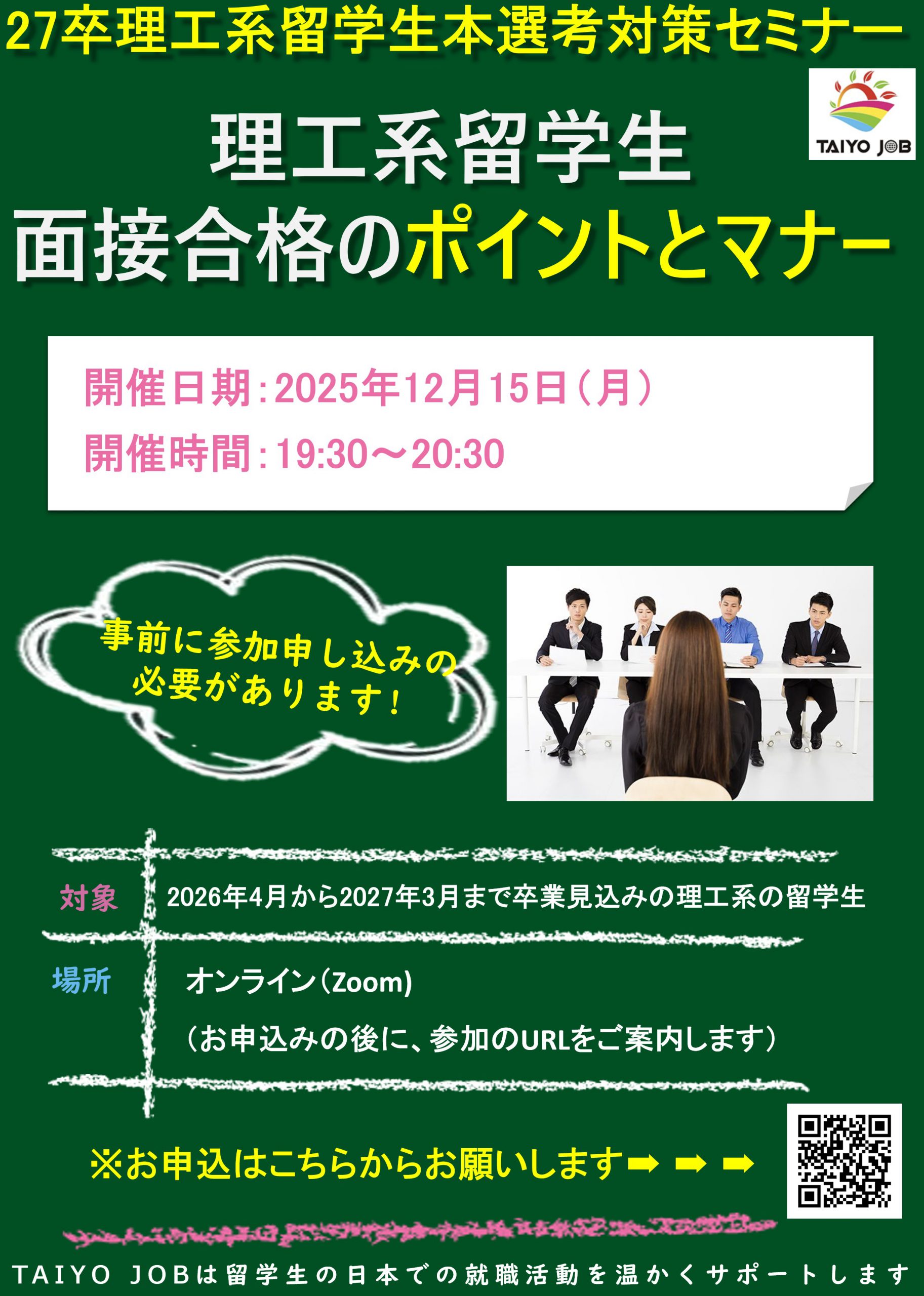 【就活対策講座】 --理工系留学生面接合格のポイントとマナー-- <セミナーの概要> ●面接におけるビジネスマナー ●オンライン面接と対面面接それぞれの注意ポイント ●面接で良い印象に残る日本語の敬語の使い方・ ●面接で理工系留学生に100%聞かれる質問とその答え方 ●面接官が面接の時チェックするポイント ●面接で高い評価をもらえる受け答えの仕方 ●面接で必要なロジカルシンキングなど ---------------------------------------------------------------------------------------- 【講師紹介】曹 琳琳 外国人留学生就職支援会社 株式会社TAIYO JOB 代表取締役 <プロフィール> 2012年より,日本各大手グローバル企業外国人人材採用のコンサル,及び外国人留学生日本での就職・転職の支援活動を行ってきました。特に理工系の就職・転職の支援に注力しており、13年にわたり,10数ヶ国,理工系の留学生を中心に、10,000名以上の留学生を日本での就職活動の成功に導きました。その他,長岡技術科学大学、豊橋技術科学大学、電気通信大学、芝浦工業大学、上智大学、東京海洋大学等の大学にて留学生就活指導の講師としても活躍しております。